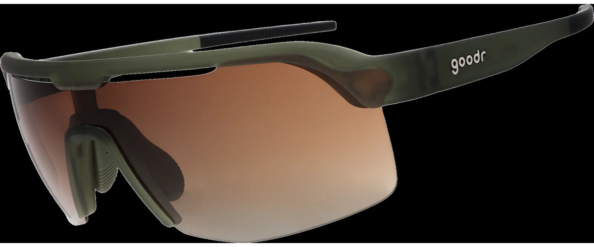 Green shield sunglasses w/ half-rim frames & amber gradient lenses shield you from light above while giving you better visibility of your feet. Won't slip or bounce while you deadlift fallen palm trees or wrassle a gorilla for the last coconut water.